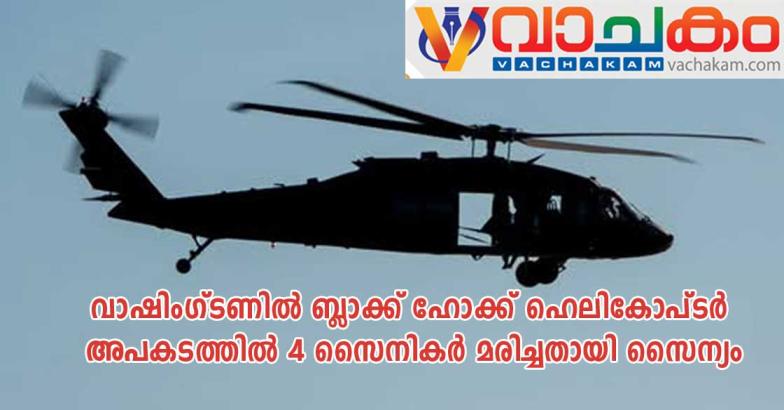 വാഷിംഗ്ടൺ : ബുധനാഴ്ച രാത്രി തർസ്റ്റൺ കൗണ്ടിയിലെ സമ്മിറ്റ് തടാകത്തിന് സമീപം തകർന്ന ബ്ലാക്ക് ഹോക്ക് ഹെലികോപ്ടറിൽ ഉണ്ടായിരുന്ന നാല് സൈനികർ അപകടത്തിൽ മരിച്ചിരിക്കാമെന്ന് സൈന്യം വെള്ളിയാഴ്ച പറഞ്ഞു.