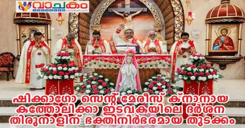 ഷിക്കാഗോ: ഷിക്കാഗോ സെന്റ് മേരീസ് ക്നാനായ കത്തോലിക്കാ ഇടവകയുടെ ഈ വർഷത്തെ പ്രധാന തിരുനാളിന് ഭക്തിനിർഭരമായ തുടക്കം. ഓഗസ്റ്റ് പതിനൊന്നുവരെ ദർശനത്തിരുനാളായി ആഘോഷിക്കുന്ന ഈ തിരുനാളിന് ഓഗസ്റ്റ് മൂന്നിന് രാവിലെ പത്തുമണിക്കുള്ള കുർബ്ബാനയ്ക്ക് ശേഷം നടത്തപ്പെട്ട പതാകയുയർത്തലോടെയാണ് തിരുക്കർമ്മങ്ങൾക്ക് തുടക്കമായത്.