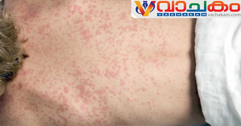 പനി, ചുമ, മൂക്കൊലിപ്പ്, കണ്ണ് ചുവക്കൽ എന്നിവയ്ക്ക് പിന്നാലെ ശരീരത്തിൽ തടിപ്പുകൾ പ്രത്യക്ഷപ്പെടുന്നു. ഇത് ന്യൂമോണിയയിലേക്കും മസ്തിഷ്ക വീക്കത്തിലേക്കും നയിക്കാൻ സാധ്യതയുണ്ട്.