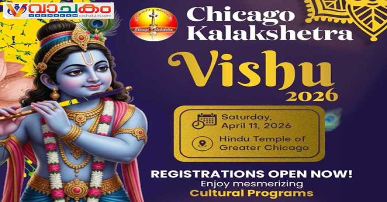 ഷിക്കാഗോ കലാക്ഷേത്രയുടെ 2026 വിഷു ആഘോഷം ഏപ്രിൽ 11 ശനിയാഴ്ച സമരതി ഓഡിറ്റോഡിയം, ഹിന്ദു ടെമ്പിൾ ഓഫ് ഗ്രേറ്റർ ഷിക്കാഗോ (10915 ലെമണ്ട് റോഡ്, ലെമണ്ട്, ഇല്ലിനോയിസ് 60439) നടത്തുവാൻ തീരുമാനിച്ചിരിക്കുന്നു.