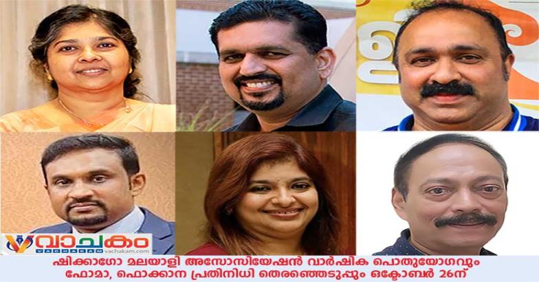ഷിക്കാഗോ : ഷിക്കാഗോ മലയാളി അസോസിയേഷൻ വാർഷിക പൊതുയോഗവും ഫോമാ, ഫൊക്കാന പ്രതിനിധികളുടെ തെരഞ്ഞെടുപ്പും ഒക്ടോബർ 26 ഞായറാഴ്ച വൈകിട്ട് 3.30ന് അസോസിയേഷൻ ഹാളിൽ നടക്കും.