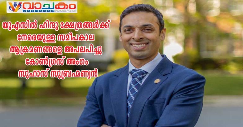 വാഷിംഗ്ടൺ ഡിസി: യുഎസിലുടനീളം ഹിന്ദു ക്ഷേത്രങ്ങൾക്ക് നേരെയുള്ള സമീപകാല ആക്രമണങ്ങളെ കോൺഗ്രസ് അംഗം സുഹാസ് സുബ്രഹ്മണ്യൻ അപലപിച്ചു, ഈ 'വെറുപ്പുളവാക്കുന്ന' പ്രവൃത്തികൾ ഒറ്റപ്പെട്ട സംഭവങ്ങളല്ല, മറിച്ച് ആരാധനാലയങ്ങൾക്ക് നേരെയുള്ള വ്യാപകമായ അക്രമത്തിന്റെ ഭാഗമാണെന്ന് പ്രസ്താവിച്ചു.