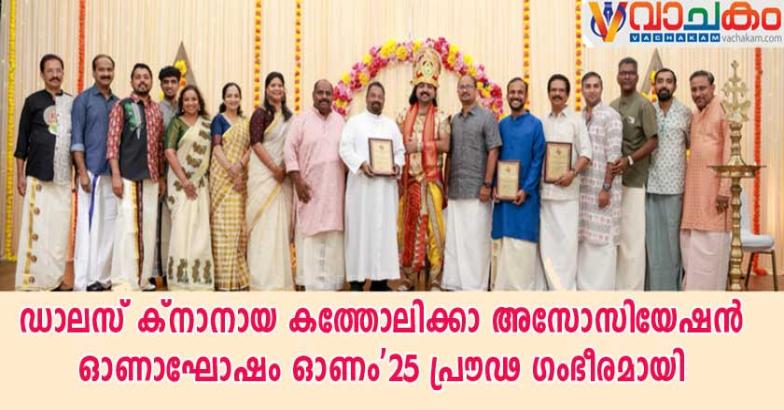 ഡാലസ്: ക്നാനായ കത്തോലിക്കാ അസോസിയേഷൻ ഓഫ് ഡാലസ് -ഫോർത്ത്വർത്ത് (കെ.സി.എ.ഡി.എഫ്.ഡബ്ല്യു) ഓണം' 2025 കേരളീയ സാംസ്കാരിക മികവോടെ ഗംഭീരമായി ആഘോഷിച്ചു. ക്രൈസ്റ്റ് ദി കിംഗ് ക്നാനായ കത്തോലിക്കാ ദേവാലയത്തിലെ ക്നായ് തോമ്മൻ ഹാളിൽ നടന്ന ചടങ്ങ് വൈകിട്ട് 6:30ന് മഹാബലിയുടെയും താലപ്പൊലിയേന്തിയ മഹിളാമണികളുടയും ചെണ്ടമേളവും ചുണ്ടൻ വള്ളവും അണിനിരത്തിയ സാംസ്കാരിക ഘോഷയാത്രയോടെ വിശിഷ്ടാതിഥികളെ വരവേറ്റു.