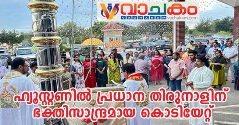 ഹൂസ്റ്റൺ: സെന്റ് മേരീസ് ക്നാനായ കത്തോലിക്ക ഫൊറോനാ ദൈവാലയത്തിൽ പ്രധാന തിരുനാളിനു ഒരുക്കമായുള്ള കൊടിയേറ്റ് ഭക്തിസാന്ദ്രമായി നടത്തപ്പെട്ടു. പരിശുദ്ധ ദൈവമാതാവിന്റെ നാമധേയത്തിൽ നടത്തപ്പെടുന്ന തിരുനാളിനു എട്ടാം തിയതി ബുധനാഴ്ച വൈകിട്ട് 6.30ന് വികാരി ഫാ.എബ്രഹാം മത്തോലത്ത്, അസ്സിസ്റ്റന്റ്.വികാരി ഫാ.ജോഷി വലിയവീട്ടിൽ എന്നിവരുടെ മുഖ്യ കാർമികത്വത്തിൽ കൊടിയേറ്റ് നടത്തപ്പെട്ടു.