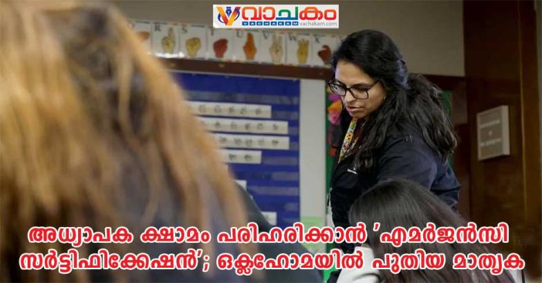 ഒക്ലഹോമ: ഒക്ലഹോമയിൽ നിലനിൽക്കുന്ന രൂക്ഷമായ അധ്യാപക ക്ഷാമം നേരിടാൻ 'എമർജൻസി സർട്ടിഫൈഡ് ' അധ്യാപകരുടെ എണ്ണം വർധിപ്പിക്കുന്നു. കഴിഞ്ഞ അഞ്ച് വർഷത്തിനിടെ 20,000ത്തിലധികം പേരെയാണ് ഇത്തരത്തിൽ നിയമിച്ചത്.