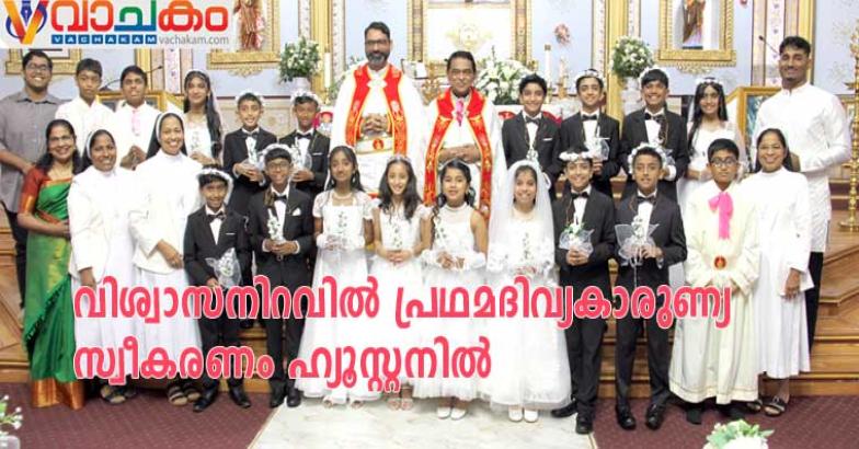 ഹ്യൂസ്റ്റൺ: സെന്റ് മേരീസ് ക്നാനായ കാത്തോലിക്ക ഫൊറോനാ ദൈവാലയത്തിൽ ആഘോഷമായ ദിവ്യകാരുണ്യ സ്വീകരണം. സെന്റ് മേരീസ് ക്നാനായ കാത്തോലിക്ക ഫൊറോന ദൈവാലയത്തിൽ കുട്ടികളുടെ ദിവ്യകാരുണ്യ സ്വീകരണം ഭക്തിസാന്ദ്രമായി നടത്തപ്പെട്ടു. മെയ് 3 ശനിയാഴ്ച രാവിലെ 10.30ന് ആരംഭിച്ച തിരുക്കർമ്മങ്ങൾക്ക് റവ.ഫാ. ഏബ്രഹാം മുത്തോലത്ത്, റവ.ഫാ. ജോഷി വലിയവീട്ടിൽ എന്നിവർ കാർമികത്വം വഹിച്ചു.