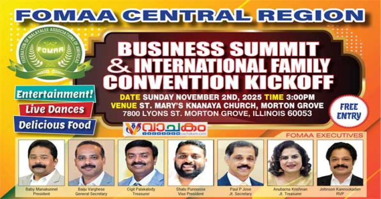 ഫോമ സെൻട്രൽ റീജിയൻ: ബിസിനസ് സമ്മിറ്റ് & ഇന്റർനാഷണൽ ഫാമിലി കൺവെൻഷൻ കിക്കോഫ് നവം.2ന്‌
