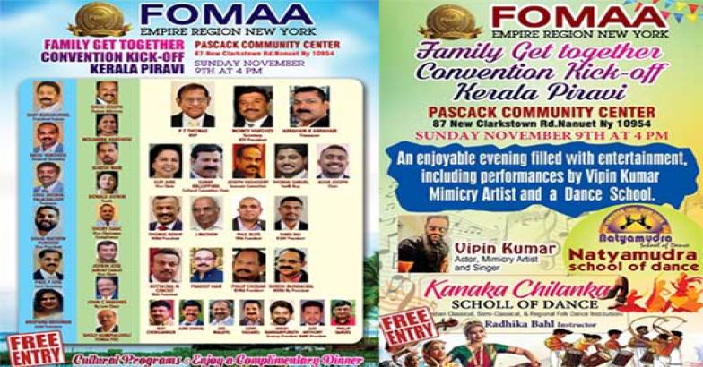 ഫോമാ എമ്പയർ റീജിയൻ കുടുംബ സംഗമം, കൺവെൻഷൻ കിക്ക് ഓഫ്, കേരള പിറവി എന്നീ മൂന്ന് ആഘോഷങ്ങൾ നവംബർ 9 ഞായറാഴ്ച 4 മണി മുതൽ നാനുവെട് പാസ്കാക് കമ്മ്യൂണിറ്റി സെന്ററിൽ വച്ചു വിപുലമായി നടത്തുന്നതാണ്. ഫോമാ എമ്പയർ റീജിയൻ ആർവിപി പി.റ്റി. തോമസിന്റെ അധ്യക്ഷതയിൽ കൂടുന്ന സമ്മേളനത്തിൽ ഫോമാ പ്രസിഡന്റ് ബേബി മണക്കുന്നേൽ മുഖ്യ പ്രാഭാഷണം നടത്തും.