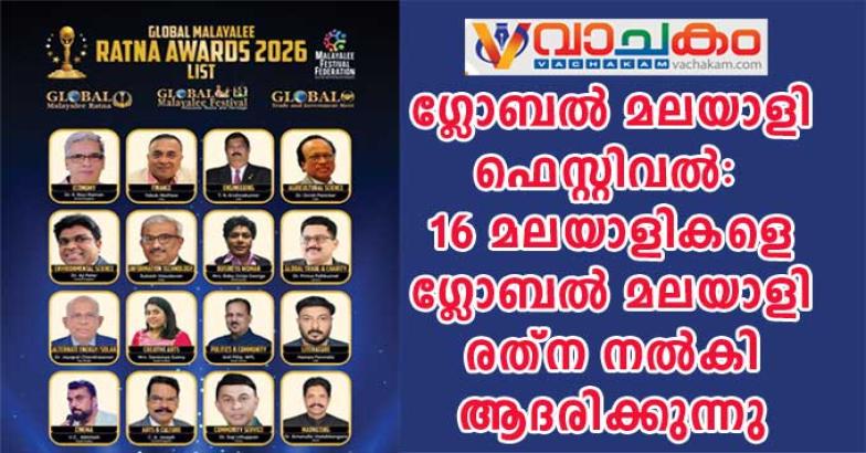 കൊച്ചി: കൊച്ചി ക്രൗൺ പ്ലാസ ഹോട്ടലിൽ ജനുവരി 1, 2 തീയതികളിൽ നടക്കുന്ന പ്രഥമ 'ഗ്ലോബൽ മലയാളി ഫെസ്റ്റിവലി'ന്റെ രണ്ടാം ദിനത്തിൽ (ജനുവരി 2) ആഗോളതലത്തിൽ തിരഞ്ഞെടുത്ത 16 മലയാളികളെ ഗ്ലോബൽ മലയാളി രത്ന പുരസ്കാരം നൽകി ആദരിക്കുന്നു.