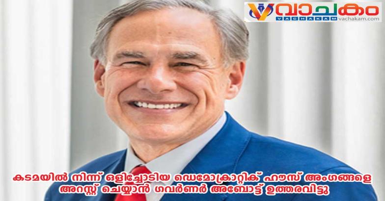 ഓസ്റ്റിൻ, ടെക്സസ്: ഡെമോക്രാറ്റിക് പാർട്ടിയിൽപ്പെട്ട ടെക്സസ് ഹൗസ് അംഗങ്ങളെ അറസ്റ്റ് ചെയ്യാൻ ഗവർണർ ഗ്രെഗ് അബോട്ട് ഉത്തരവിട്ടു. ടെക്സാസിലെ ജനങ്ങളോടുള്ള തങ്ങളുടെ കടമയിൽ നിന്ന് ഹൗസ് അംഗങ്ങൾ ഒളിച്ചോടിയെന്ന് ഗവർണർ പറഞ്ഞു.