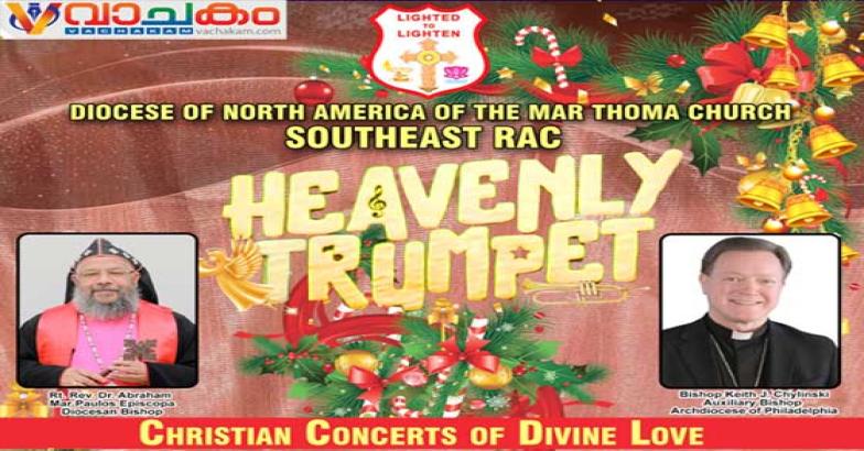 ഫിലഡൽഫിയ : മാർത്തോമാ സഭയുടെ നോർത്ത് അമേരിക്കൻ ഭദ്രാസനത്തിന്റെ ആഭിമുഖ്യത്തിൽ സൗത്ത് ഈസ്റ്റ് റീജനൽ ആക്ടിവിറ്റി കമ്മിറ്റിയും സഭയുടെ സംഗീത വിഭാഗമായ ഡി.എസ്.എം.സി യും സംയുക്തമായി 2025 നവംബർ മാസം 29 -ാം തിയതി ശനിയാഴ്ച 4:00 മുതൽ 7 :30 വരെ പെൻസിൽവേനിയയിലെ മെൽറോസ് പാർക്കിൽ സ്ഥിതി ചെയ്യുന്ന OLD GRATZ കോളേജ് ഓഡിറ്റോറിയത്തിൽ ( 7605 old York Rd., Melrose Park, PA-19027) വച്ച് നടത്തപ്പെടുന്ന ഹെവൻലി ട്രമ്പറ്റിന്റെ 2025 ഒരുക്കങ്ങൾ പൂർത്തിയായതായി ഭാരവാഹികൾ അറിയിച്ചു.