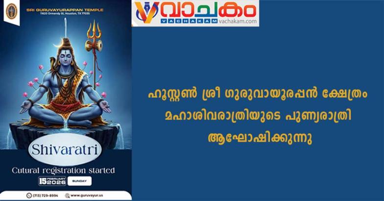 ഹൂസ്റ്റൺ, ടെക്‌സസ് : 2026 ഫെബ്രുവരി പതിനഞ്ചാം തിയതി ഞായറാഴ്ച ഹൂസ്റ്റൺ ശ്രീ ഗുരുവായൂരപ്പൻ ക്ഷേത്രം ഭക്തരെയും വിശാലമായ സമൂഹത്തെയും മഹാശിവരാത്രി ആചരിക്കാൻ