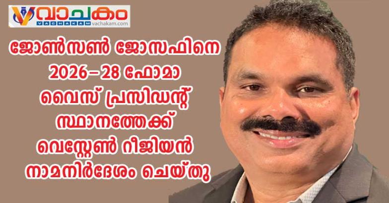 കാലിഫോർണിയ: അമേരിക്കൻ മലയാളികളുടെ കേന്ദ്ര സംഘടന ഫെഡറേഷൻ ഓഫ് മലയാളി അസോസിയേഷൻ ഓഫ് അമേരിക്ക (FOMAA) യുടെ 2026-28 വർഷത്തേക്കുള്ള വൈസ് പ്രസിഡന്റ് സ്ഥാനത്തേക്ക് ജോൺസൺ ജോസഫിനെ വെസ്റ്റേൺ റീജിയണൽ കമ്മിറ്റി ഔദ്യോഗികമായി നാമനിർദേശം ചെയ്തു.