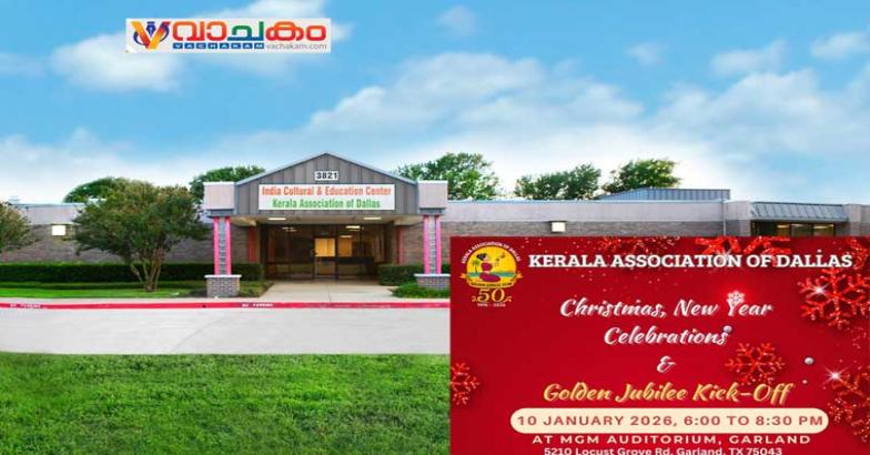 ഡാളസ്: കേരള അസോസിയേഷൻ ഓഫ് ഡാളസിന്റെ  50-ാം വാർഷികഘോഷങ്ങൾക്കും ക്രിസ്തുമസ്പുതുവത്സര പരിപാടികൾക്കും ജനുവരി 10ന് തുടക്കമാകും. ഗാർലൻഡിലെ എം.ജി.എം ഓഡിറ്റോറിയത്തിൽ വെച്ച് വൈകുന്നേരം 6 മണി മുതൽ 8:30 വരെയാണ് ചടങ്ങുകൾ സംഘടിപ്പിച്ചിരിക്കുന്നത്.