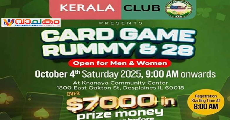 കേരള ക്ലബ് ചീട്ടുകളി മത്സരത്തിലേക്കു എല്ലാ ചീട്ടുകളി പ്രേമികളെയും വളരെ സ്നേഹത്തോടെ സംഘാടക സമിതി സ്വാഗതം ചെയ്യുന്നു. 28 (ലേലം) ഓപ്പൺ വിഭാഗത്തിൽ 3 അംഗ ടീമിന്റെ രജിസ്ട്രേഷൻ ഫീ 150 ഡോളറും, റമ്മി വിഭാഗത്തിൽ ഇന്റിവിജ്വൽ രജിസ്ട്രേഷൻ ഫീ 100 ഡോളറും വനിതാ വിഭാഗത്തിൽ 3 അംഗ ടീമിന്റെ രജിസ്ട്രേഷൻ ഫീ 75 ഡോളറും ആയിരിക്കും.