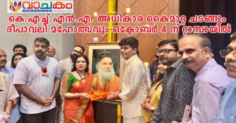 സനാതന ധർമ്മ പ്രചാരണത്തിന്റെ രജതജൂബിലി പൂർത്തീകരിച്ച കെ.എച്ച്.എൻ.എയുടെ പതിനാലാമതു പ്രസിഡന്റായി തെരഞ്ഞെടുക്കപ്പെട്ട ഉണ്ണികൃഷ്ണനും സംഘത്തിനും നിലവിലെ പ്രസിഡന്റ് ഡോ: നിഷ പിള്ളയുടെയും സഹഭാരവാഹികളുടെയും ഔപചാരികമായ അധികാര കൈമാറ്റം ഒക്ടോബർ 4 ശനിയാഴ്ച്ച ടാമ്പായിൽ നടക്കുന്ന ദീപാവലി ആഘോഷങ്ങളുടെ ഭാഗമായ ഹൈന്ദവ സദസ്സിൽ വച്ച് വിവിധ പരിപാടികളോടെ നിർവഹിക്കപ്പെടുന്നു.