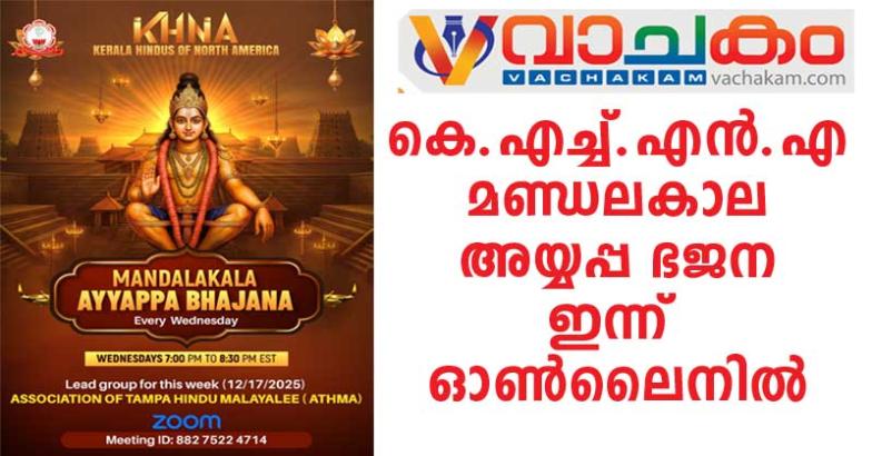 ടാംപ (ഫ്ളോറിഡ): മണ്ഡലമകരവിളക്ക് തീർത്ഥാടന കാലത്തോടനുബന്ധിച്ച് വടക്കേ അമേരിക്കയിലെ അയ്യപ്പ ഭക്തർക്കായി കേരള ഹിന്ദുസ് ഓഫ് നോർത്ത് അമേരിക്ക (KHNA) എല്ലാ ബുധനാഴ്ചയും ഓൺലൈൻ 'മണ്ഡലകാല അയ്യപ്പ ഭജന' നടത്തുന്നു.