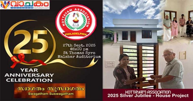 ഫിലാഡൽഫിയയിലും പരിസര പ്രദേശങ്ങളിലുമായി അധിവസിച്ചു വരുന്ന കോട്ടയം സ്വദേശികളുടെ സംഘടനയായ ഫിലാഡൽഫിയ കോട്ടയം അസോസിയേഷന്റെ സിൽവർ ജൂബിലി ആഘോഷങ്ങളുടെ ഭാഗമായി സെപ്തംബർ 27 ശനിയാഴ്ച വൈകിട്ട് 5:30നു വെൽഷ് റോഡിലുള്ള സെന്റ് തോമസ് സീറോ മലബാർ ചർച്ച് ഓഡിറ്റോറിയത്തിൽ വച്ച് നടത്തപ്പെടുന്ന ജൂബിലി ബാങ്ക്വെറ്റിനുള്ള ഒരുക്കങ്ങൾ എല്ലാം പൂർത്തിയായതായി ഭാരവാഹികൾ അറിയിച്ചു.