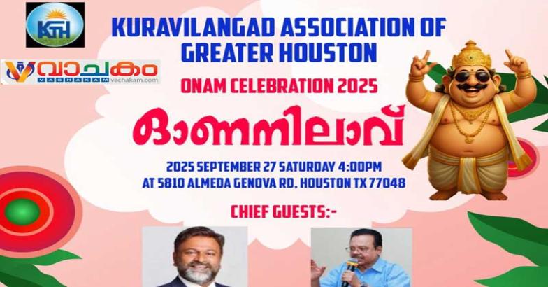ഹൂസ്റ്റൺ: ടെക്സാസിലെ ഗ്രേറ്റർ ഹൂസ്റ്റൺ ഏരിയയിൽ ആരംഭിച്ചിരിക്കുന്ന കുറവിലങ്ങാട് അസോസിയേഷൻ ഓഫ് ഗ്രേറ്റർ ഹൂസ്റ്റൺ എന്ന സംഘടനയുടെ പ്രഥമ ഓണാഘോഷം 'ഓണനിലാവ് ' എന്ന പേരിൽ സെപ്തംബർ 27 ശനിയാഴ്ച വൈകുന്നേരം 4 മണി മുതൽ ട്രിനിറ്റി മാർത്തോമാ ചർച്ച് ഹാളിൽ വമ്പിച്ച പരിപാടികളോടെ ആഘോഷിക്കുകയാണ്.