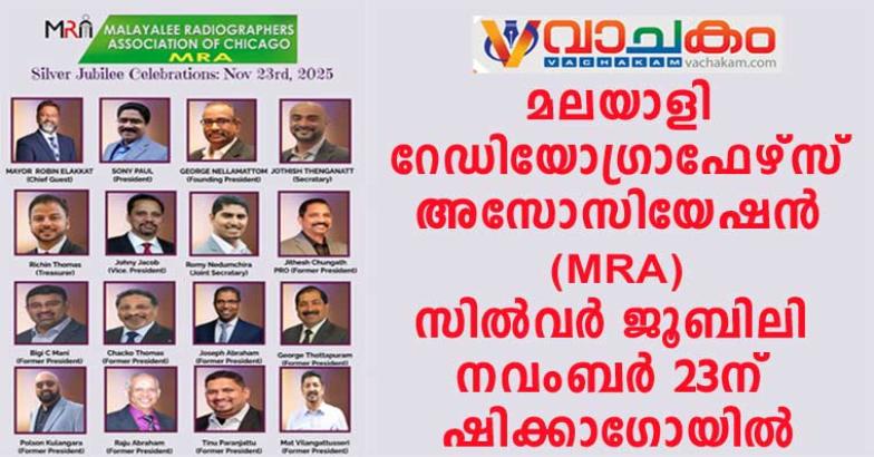 ഷിക്കാഗോ: അമേരിക്കൻ മലയാളി റേഡിയോളജി പ്രൊഫഷണലുകളുടെ സംഘടനയായ മലയാളി റേഡിയോഗ്രാഫേഴ്സ് അസോസിയേഷന്റെ (MRA) രജതജൂബിലി ആഘോഷം (25th Anniversary)2025 നവംബർ 23ന് വൈകുന്നേരം അഞ്ച് മണിയ്ക്ക് നോർത്ത് ബ്രൂക്കിലെ സെഞ്ചുറിയൻ ബാങ്ക്വറ്റ് ഹാളിൽ (3315 Milwaukee Ave, Northbrook, IL 60062) വച്ച് നടത്തപ്പെടുന്നു.