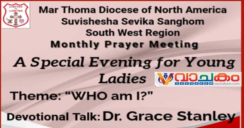 ഡാളസ്: നോർത്ത് അമേരിക്ക മാർത്തോമാ ഭദ്രാസന സൗത്ത് വെസ്റ്റ് റീജിയൻ സുവിശേഷ സേവിക സംഘം, യുവതികൾക്കായി പ്രത്യേകം നടത്തപ്പെടുന്ന പ്രയർ മീറ്റിംഗ് ഒക്ടോബർ 7 ചൊവ്വ വൈകിട്ട് 7.30ന് (സൂം വഴിയായി) സംഘടിപ്പിക്കുന്നു.