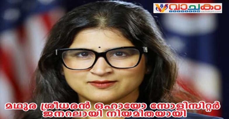 കൊളംബസ്, ഒഹായോ: മഥുര ശ്രീധരൻ ഒഹായോയുടെ 12-ാമത് സോളിസിറ്റർ ജനറലായി നിയമിതയായി. സംസ്ഥാനത്തെ ഏറ്റവും മികച്ച അപ്പലേറ്റ് അഭിഭാഷകയായി. അറ്റോർണി ജനറൽ ഡേവ് യോസ്റ്റിന്റെ ഓഫീസ് എക്സിൽ (മുമ്പ് ട്വിറ്റർ) അവരുടെ സ്ഥാനക്കയറ്റം പ്രഖ്യാപിച്ചു.