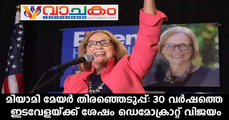 ഫ്ളോറിഡ: ചൊവ്വാഴ്ച നടന്ന മയാമിഡേഡ് കൗണ്ടി മേയർ റൺഓഫ് തിരഞ്ഞെടുപ്പിൽ മുൻ മിയാമിഡേഡ് കൗണ്ടി കമ്മീഷണർ എലീൻ ഹിഗ്ഗിൻസ് വിജയിച്ചു, ഇതോടെ, 30 വർഷത്തിലധികമായി മിയാമി നഗരത്തിൽ ഒരു ഡെമോക്രാറ്റ് മേയറായി തിരഞ്ഞെടുക്കപ്പെടുന്നത് ഇതാദ്യമാണ്.