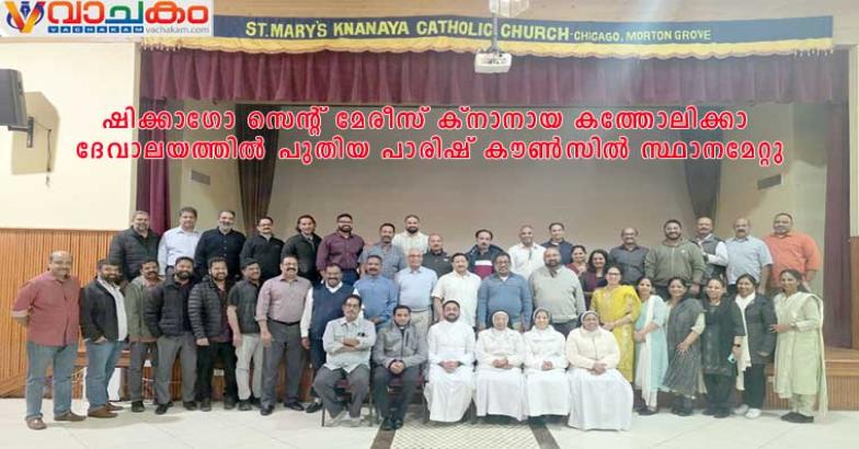 ഷിക്കാഗോ സെന്റ് മേരീസ് ക്നാനായ കത്തോലിക്കാ ദേവാലയത്തിൽ 2026 -27 വർഷത്തേക്കുള്ള പുതിയ പാരീഷ് കൗൺസിൽ സ്ഥാനമേറ്റു. ഇതോടനുബന്ധിച്ചു സ്ഥാനമൊഴിയുന്ന 2024 -25 വർഷത്തെ പാരീഷ് കൗൺസിൽ അംഗങ്ങളുടെയും 2026 -27 വർഷത്തെ പാരീഷ് കൗൺസിൽ അംഗങ്ങളുടെയും ഒരു സംയുക്ത യോഗം ഫെബ്രുവരി മൂന്നാം തിയതി ചേരുകയുണ്ടായി.