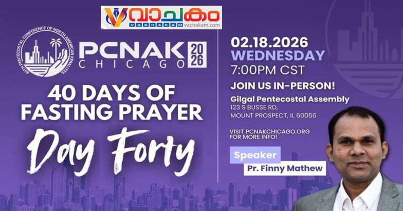 ഷിക്കാഗോ: ജൂലൈ ആദ്യവാരം ഷിക്കാഗോയിൽ നടക്കുന്ന 40-ാമത് പെന്തക്കോസ്തൽ കോൺഫറൻസ് ഓഫ് നോർത്ത് അമേരിക്കയുടെ അനുഗ്രഹത്തിന് വേണ്ടി ജനുവരി 10ന് ആരംഭിച്ച 40 ദിവസത്തെ ഉപവാസ പ്രാർത്ഥന ഫെബ്രുവരി 18 ബുധനാഴ്ച സമാപിക്കും.