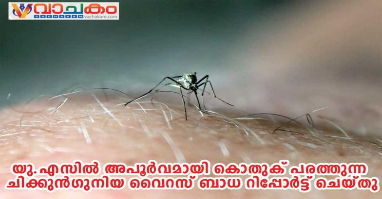 ന്യൂയോർക്കിൽ പ്രാദേശികമായി രോഗം സ്ഥിരീകരിച്ച ആദ്യ കേസ്; അധികൃതർ ജാഗ്രത നിർദേശം നൽകി. അമേരിക്കൻ ഐക്യനാടുകളിൽ കൊതുക് പരത്തുന്ന അപൂർവ രോഗമായ ചിക്കുൻഗുനിയ വൈറസ് ബാധ സ്ഥിരീകരിച്ചു.
