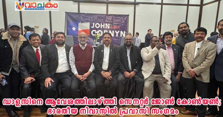 ഡാളസ്: 2026 മാർച്ച് 3ന് നടക്കാനിരിക്കുന്ന റിപ്പബ്ലിക്കൻ പ്രൈമറിയിൽ നിലവിലുള്ള സെനറ്റർ ജോൺ കോൺയൺ തെരഞ്ഞെടുപ്പ് പ്രചാരണത്തിന്റെ ഭാഗമായി ഡാളസ് മെട്രോപ്ലെക്സിന്റെ ഹൃദയഭാഗത്തുള്ള ഭാരതീയ നിവാസ് ഗ്രാന്റ് ബാർ റൂമിൽ വിപുലമായ ജനസമ്പർക്ക പരിപാടി സംഘടിപ്പിച്ചു. അമേരിക്കയിലെ ഇന്ത്യൻ പ്രവാസി സമൂഹത്തിന്റെ കരുത്ത് വിളിച്ചോതുന്നതായിരുന്നു. ഈ ഒത്തുചേരലിനു ഡോ. എ.കെ. മംഗോ നേതൃത്വം നൽകി.