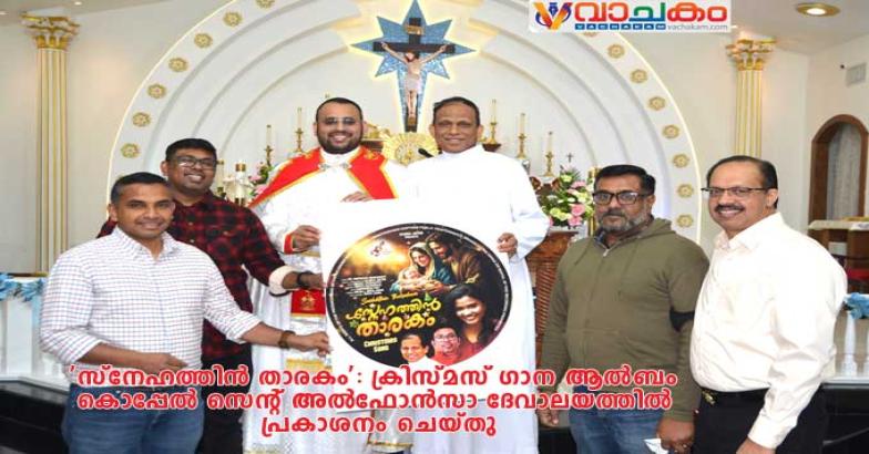 കൊപ്പേൽ (ഡാളസ്): കൊപ്പേൽ സെന്റ് അൽഫോൻസാ ഇടവക വികാരി ഫാ. മാത്യൂസ് മുഞ്ഞനാട്ട് വരികളെഴുതി, സംഗീത സംവിധായകൻ സ്കറിയ ജേക്കബ് ഈണം പകർന്ന 'സ്നേഹത്തിൻ താരകം' എന്ന പുതിയ ക്രിസ്മസ് കരോൾ ഗാന ആൽബം പ്രകാശനം ചെയ്തു.