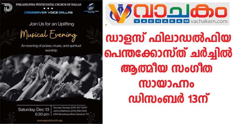 ടെക്സസ്: ഡാളസിലെ ഫിലാഡൽഫിയ പെന്തക്കോസ്ത് ചർച്ചിൽ ആത്മീയ സംഗീത സായാഹ്നം ഒരുക്കുന്നു. ക്രോസ്റിവർ വോയ്സ് ഡാളസ് (CROSSRIVER VOICE DALLAS) അവതരിപ്പിക്കുന്ന 'ഒരു ഉണർവ് നൽകുന്ന സംഗീത സായാഹ്നം' (An Uplifting Musical Evening) എന്ന പരിപാടിയിൽ സംഗീതം, ആത്മീയ ആരാധന എന്നിവയുണ്ടായിരിക്കുമെന്നു സംഘാടകർ അറിയിച്ചു.