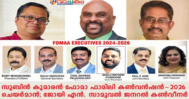 ഹൂസ്റ്റൺ: അമേരിക്കൻ മലയാളികളുടെ ഏറ്റവും വലിയകേന്ദ്ര സംഘടനനായ ഫോമായുടെ 2026ലെ ഒമ്പതാമത് ഇന്റർനാഷണൽ ഫാമിലി കൺവൻഷന്റെ ചെയർമാനായി സാമൂഹിക സാംസ്കാരിക പ്രവർത്തകനും വ്യവസായിയുമായ സുബിൻ കുമാരനെയും ജനറൽ കൺവീനറായി സംഘാടകനായ ജോയി എൻ. സാമുവലിനെയും ഫോമാ മിഡ്ടേം ജനറൽ ബോഡി തിരഞ്ഞെടുത്തതായി പ്രസിഡന്റ് ബേബി മണക്കുന്നേൽ അറിയിച്ചു. വ്യക്തിപരമായ കാരണങ്ങളാൽ, നിലവിലെ ചെയർമാൻ മാത്യൂസ് മുണ്ടയ്ക്കൽ സ്ഥാനമൊഴിഞ്ഞതിനെ തുടർന്നാണ് ജനറൽ കൺവീനറായ സുബിൻ കുമാരനെ തൽസ്ഥാനത്തേയ്ക്ക് നിയോഗിച്ചതെന്ന് ബേബി മണക്കുന്നേൽ പറഞ്ഞു.