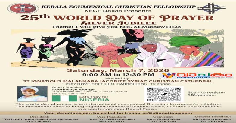 ഡാളസ് : കേരള എക്യുമെനിക്കൽ ക്രിസ്ത്യൻ ഫെല്ലോഷിപ്പ് ഡാലസിന്റെ ആഭിമുഖ്യത്തിൽ 25 -ാമത് ലോക പ്രാർത്ഥനാ ദിനവും സിൽവർ ജൂബിലി ആഘോഷങ്ങളും സംഘടിപ്പിക്കുന്നു. 2026 മാർച്ച് 7 ശനിയാഴ്ച രാവിലെ 9:00 മുതൽ ഉച്ചയ്ക്ക് 12:30 വരെ കാരൾട്ടണിലുള്ള സെന്റ് ഇഗ്നേഷ്യസ് മലങ്കര യാക്കോബായ സുറിയാനി ക്രിസ്ത്യൻ കത്തീഡ്രലിൽ വെച്ചാണ് (2707 Dove Creek Ln, Carrollton, TX 75006) ഈ പ്രാർത്ഥനാസംഗമം നടക്കുന്നത്.