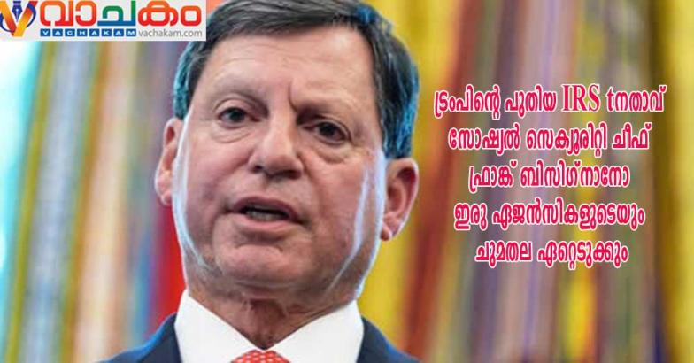 വാഷിംഗ്ടൺ: യു.എസ്. പ്രസിഡന്റ് ഡോണൾഡ് ട്രംപ് ആഭ്യന്തര വരുമാന സേവന ഏജൻസിയായ IRS-ന്റെ നേതൃത്വത്തിൽ പുതിയതായൊരു തീരുമാനമെടുത്തു. സോഷ്യൽ സെക്യൂരിറ്റി അഡ്മിനിസ്ട്രേറ്റർ ഫ്രാങ്ക് ബിസിഗ്നാനോയെ IRS-ന്റെ 'ചീഫ് എക്സിക്യുട്ടീവ് ഓഫീസർ' എന്ന പദവിയിലേക്ക് നിയമിച്ചിട്ടുണ്ട്. ഇത് IRS-ൽ നിലവിലില്ലാത്ത പദവിയാണ്.